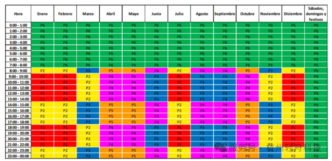 西班牙的分時和中國不同,分為P1-P6不同的時段,且每個月以及節(jié)假日均有差異,不同的時段的需量要求也不相同,如下圖所示: