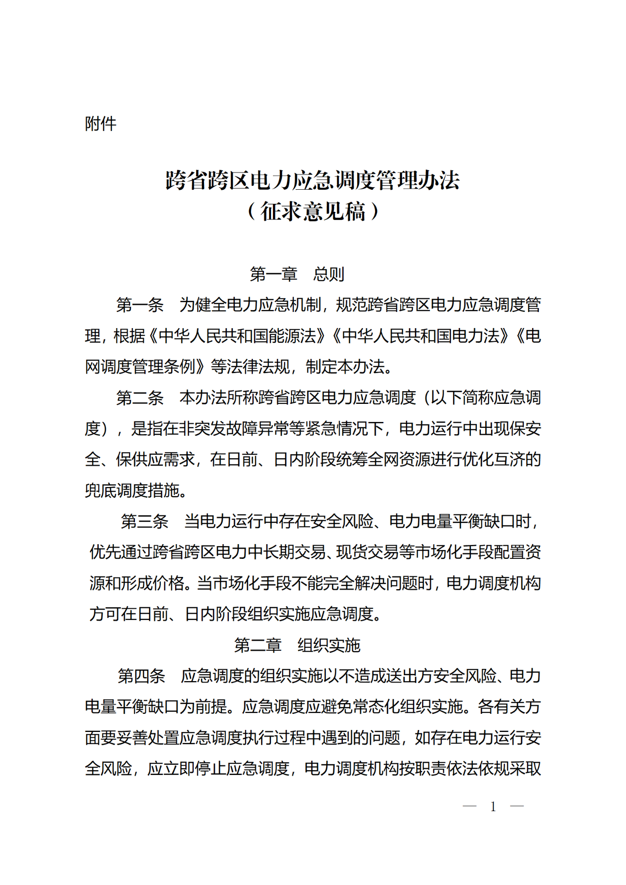 附件:跨省跨區(qū)電力應急調度管理辦法(征求意見稿)