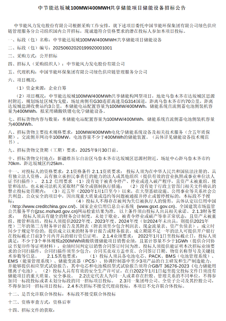 中國(guó)儲(chǔ)能網(wǎng)訊:6月13日,中節(jié)能達(dá)坂城100MW/400MWh共享儲(chǔ)能項(xiàng)目?jī)?chǔ)能設(shè)備招標(biāo)。項(xiàng)目招標(biāo)人為中節(jié)能風(fēng)力發(fā)電股份有限公司,建設(shè)資金來(lái)源為自籌。