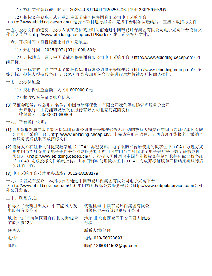 招標(biāo)文件獲取時(shí)間為2025年6月14日到2025年6月19日23時(shí)59分59秒,獲取方式為中國(guó)節(jié)能環(huán)保集團(tuán)有限公司電子采購(gòu)平臺(tái),投標(biāo)文件遞交截止時(shí)間/開(kāi)標(biāo)時(shí)間為2025年7月7日9時(shí)30分,線上開(kāi)標(biāo)。