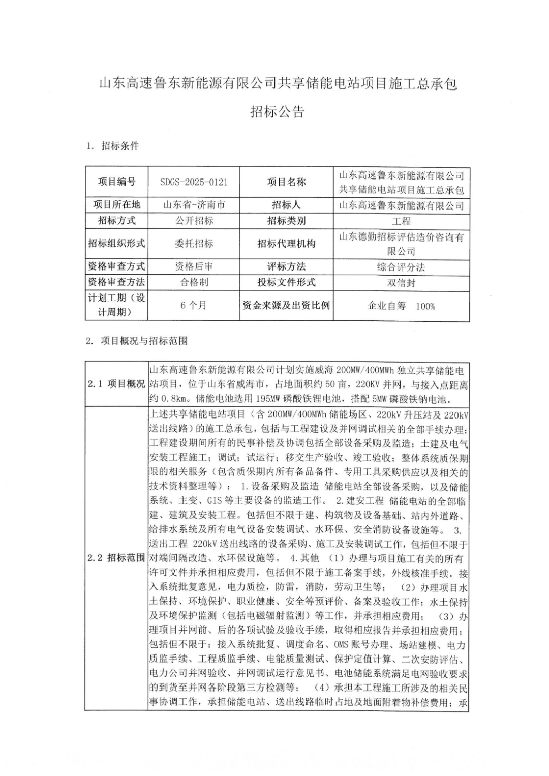 中國儲能網(wǎng)訊:山東高速魯東新能源有限公司共享儲能電站項(xiàng)目施工總承包招標(biāo)公告發(fā)布,項(xiàng)目位于山東威海,招標(biāo)人為山東高速魯東新能源有限公司。