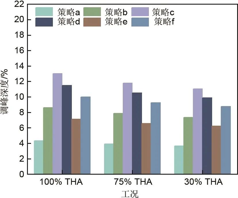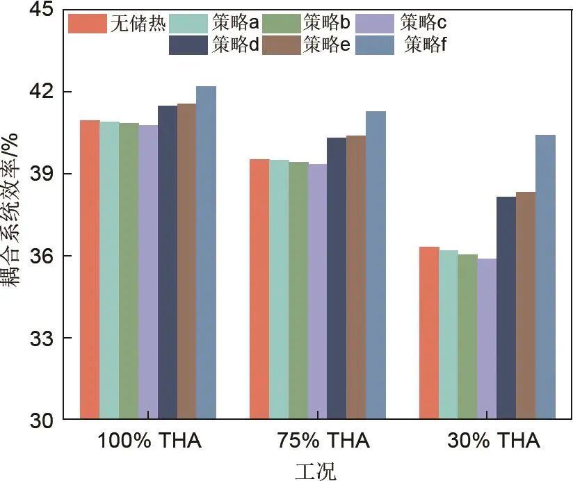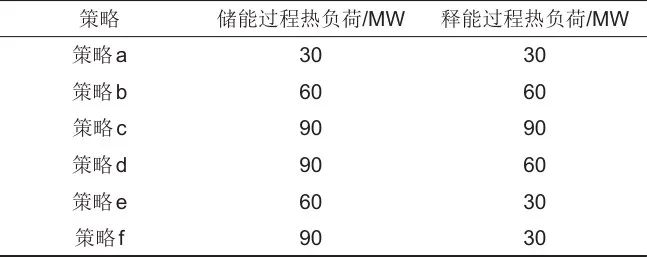 表2展示了根據(jù)儲(chǔ)/釋能過程中不同熱負(fù)荷制定的6種全過程運(yùn)行策略。圖7~9分別為火儲(chǔ)-熱泵聯(lián)合的儲(chǔ)熱形式在不同儲(chǔ)能釋能策略下全過程的系統(tǒng)效率、調(diào)峰容量和調(diào)峰深度。從圖7可以看出,儲(chǔ)能過程和釋能過程熱負(fù)荷相同時(shí),耦合系統(tǒng)循環(huán)效率隨著儲(chǔ)熱負(fù)荷的提高而降低,但降幅較小,當(dāng)儲(chǔ)釋熱負(fù)荷為90 MW時(shí),100%THA運(yùn)行的循環(huán)過程僅有0.16%的效率降低,而通過圖8和圖9可以看出,此時(shí)的調(diào)峰容量和調(diào)峰深度則可達(dá)78.29 MW和13.04%。因此,儲(chǔ)熱的增加對(duì)于電廠的靈活運(yùn)行是有利的。當(dāng)儲(chǔ)能過程熱負(fù)荷一定時(shí),釋能過程熱負(fù)荷越低,耦合系統(tǒng)效率越高;當(dāng)釋能過程熱負(fù)荷一定時(shí),儲(chǔ)能過程熱負(fù)荷越高耦合系統(tǒng)效率越高。這是由于釋熱過程中未利用的部分,可以作為備用熱源,用于其他場景。從圖8和圖9可以看出,儲(chǔ)/釋能過程熱負(fù)荷越高的策略,耦合系統(tǒng)的調(diào)峰容量和調(diào)峰深度也越大,如100%THA、75%THA和30%THA工況下的調(diào)峰容量和調(diào)峰深度最大的均為策略c,然而此時(shí)的系統(tǒng)效率在不同電廠運(yùn)行工況下均為最低。當(dāng)電廠以不同負(fù)荷運(yùn)行時(shí),對(duì)于儲(chǔ)釋熱負(fù)荷相同的a,b和c三個(gè)運(yùn)行策略,其儲(chǔ)/釋能循環(huán)過程的單位熱負(fù)荷調(diào)峰容量依次為0.87 MW,0.79 MW和0.74 MW。