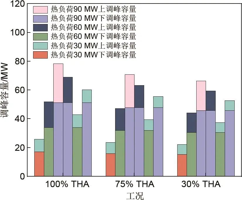 圖5和圖6分別為釋能過程中不同儲(chǔ)熱負(fù)荷下的系統(tǒng)效率,調(diào)峰容量和調(diào)峰深度。從圖5可以看出,由于熔鹽與蒸汽換熱時(shí)存在溫差損失,釋能過程耦合系統(tǒng)的效率相較于無儲(chǔ)熱的電廠熱效率更低,且隨著儲(chǔ)熱負(fù)荷的增加,釋能過程的系統(tǒng)效率逐漸減小。此外,當(dāng)電廠以更高的負(fù)荷運(yùn)行時(shí),儲(chǔ)熱負(fù)荷的變化對(duì)于系統(tǒng)效率的影響更小,當(dāng)電廠為100%THA,儲(chǔ)熱負(fù)荷為90 MW時(shí),耦合系統(tǒng)效率降低量僅為0.63%,而電廠為30%THA,儲(chǔ)熱負(fù)荷為30 MW時(shí),耦合系統(tǒng)效率降低量則為2.05%。由圖6可以看出,釋能過程的調(diào)峰容量及調(diào)峰深度與儲(chǔ)熱負(fù)荷和電廠負(fù)荷均呈現(xiàn)正相關(guān)關(guān)系。釋能過程中,不同電廠運(yùn)行負(fù)荷下,單位儲(chǔ)熱負(fù)荷的調(diào)峰容量依次為0.30 MW,0.26 MW和0.23 MW。