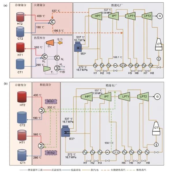 圖1 耦合火電廠靈活調(diào)峰的卡諾電池儲(chǔ)能系統(tǒng):(a) 儲(chǔ)能過(guò)程;(b) 釋能過(guò)程