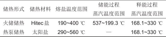 釋能過(guò)程:如圖1(b)所示,汽輪機(jī)組除氧器OFW的部分蒸汽被引出,經(jīng)過(guò)HT1中的太陽(yáng)鹽或HT2中的Hitec鹽加熱,然后送回低壓缸LPT1入口做功。用電高峰期時(shí),可同時(shí)利用鍋爐和熱鹽罐釋放熱量與蒸汽換熱來(lái)發(fā)電。表1總結(jié)了儲(chǔ)熱部分中不同儲(chǔ)熱形式對(duì)應(yīng)的儲(chǔ)熱材料和溫度范圍。