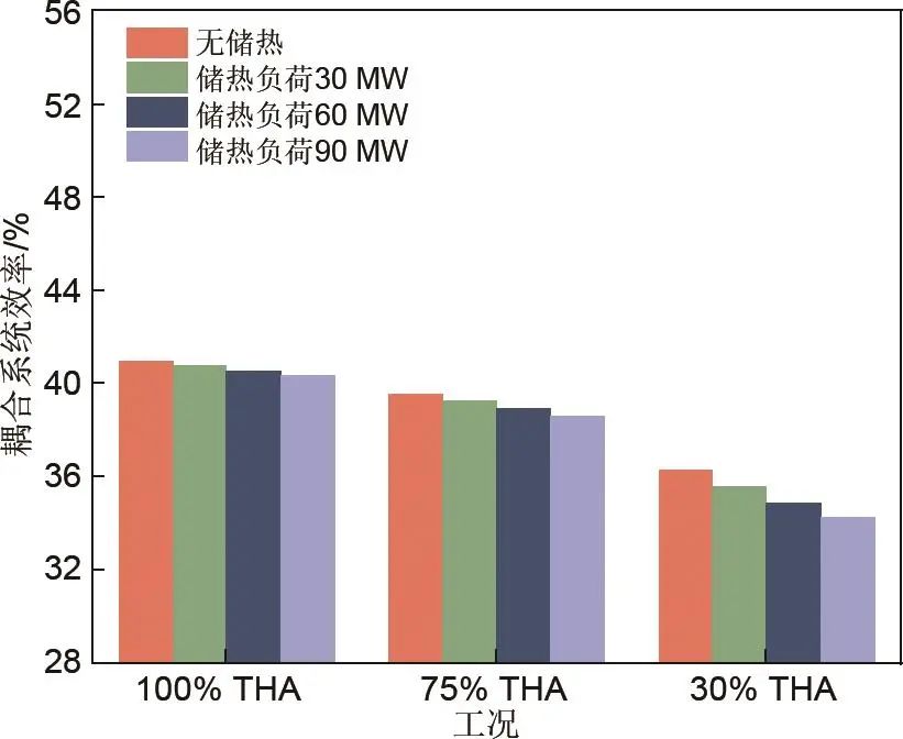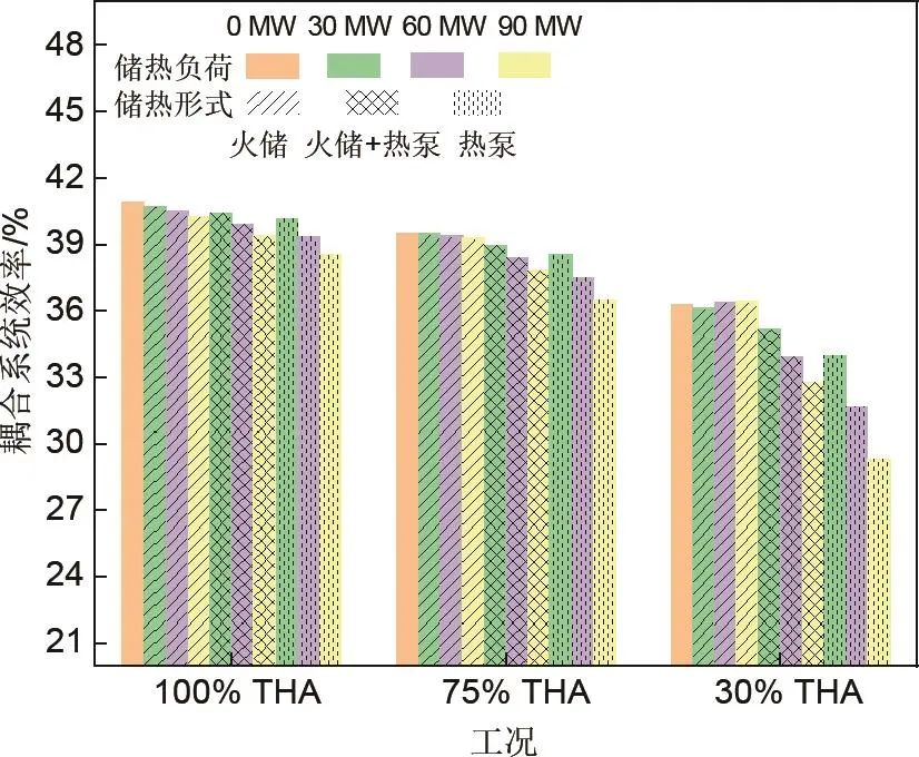 耦合系統(tǒng)在儲(chǔ)能過(guò)程中可以通過(guò)火儲(chǔ)儲(chǔ)熱,也可以通過(guò)熱泵循環(huán)儲(chǔ)熱。因此,分析了30%THA、75%THA和100%THA三種工況下,純火儲(chǔ)、火儲(chǔ)-熱泵聯(lián)合以及純熱泵三種儲(chǔ)能方式性能表現(xiàn),并探討了不同耦合方案的影響。