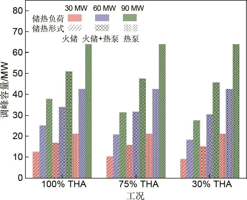 (1)對(duì)于儲(chǔ)能過(guò)程,耦合系統(tǒng)的調(diào)峰性能會(huì)隨著儲(chǔ)熱負(fù)荷的提高而增加,當(dāng)儲(chǔ)熱負(fù)荷為90 MW時(shí),可以通過(guò)純熱泵儲(chǔ)熱方式獲得最高63.97 MW的調(diào)峰容量和10.65%的調(diào)峰深度。在電廠以高負(fù)荷運(yùn)行時(shí),儲(chǔ)熱負(fù)荷越高,系統(tǒng)效率越低,且熱泵儲(chǔ)熱方式對(duì)系統(tǒng)效率的降低更為顯著。熱泵儲(chǔ)熱方式在調(diào)峰容量和調(diào)峰深度方面相較于火儲(chǔ)儲(chǔ)熱更具優(yōu)勢(shì),其單位儲(chǔ)熱負(fù)荷的最大調(diào)峰容量相較于火儲(chǔ)方式可提高69%。