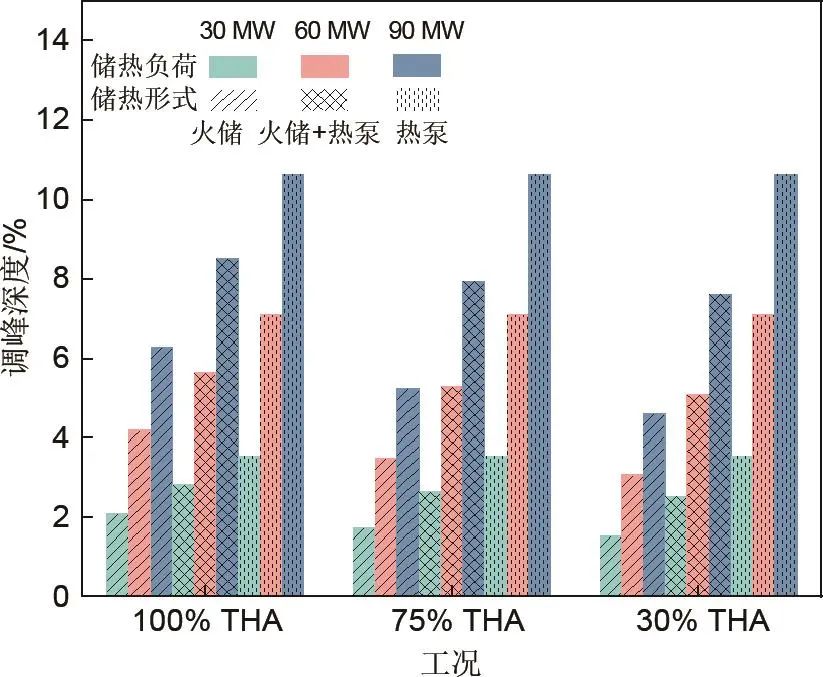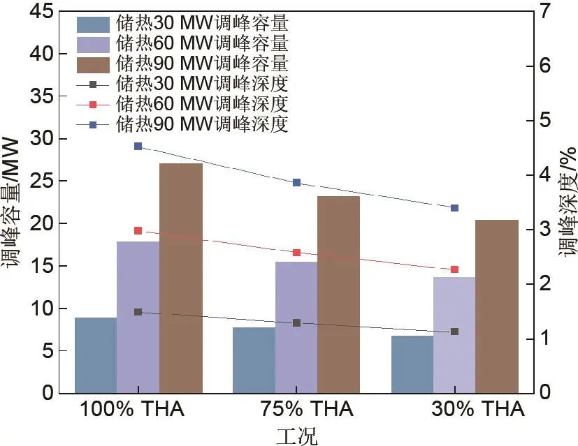 圖5和圖6分別為釋能過(guò)程中不同儲(chǔ)熱負(fù)荷下的系統(tǒng)效率,調(diào)峰容量和調(diào)峰深度。從圖5可以看出,由于熔鹽與蒸汽換熱時(shí)存在溫差損失,釋能過(guò)程耦合系統(tǒng)的效率相較于無(wú)儲(chǔ)熱的電廠熱效率更低,且隨著儲(chǔ)熱負(fù)荷的增加,釋能過(guò)程的系統(tǒng)效率逐漸減小。此外,當(dāng)電廠以更高的負(fù)荷運(yùn)行時(shí),儲(chǔ)熱負(fù)荷的變化對(duì)于系統(tǒng)效率的影響更小,當(dāng)電廠為100%THA,儲(chǔ)熱負(fù)荷為90 MW時(shí),耦合系統(tǒng)效率降低量?jī)H為0.63%,而電廠為30%THA,儲(chǔ)熱負(fù)荷為30 MW時(shí),耦合系統(tǒng)效率降低量則為2.05%。由圖6可以看出,釋能過(guò)程的調(diào)峰容量及調(diào)峰深度與儲(chǔ)熱負(fù)荷和電廠負(fù)荷均呈現(xiàn)正相關(guān)關(guān)系。釋能過(guò)程中,不同電廠運(yùn)行負(fù)荷下,單位儲(chǔ)熱負(fù)荷的調(diào)峰容量依次為0.30 MW,0.26 MW和0.23 MW。