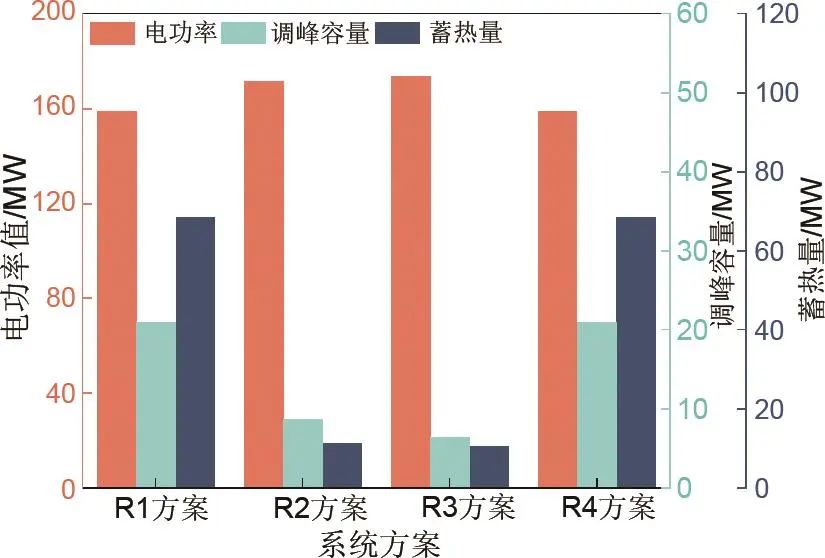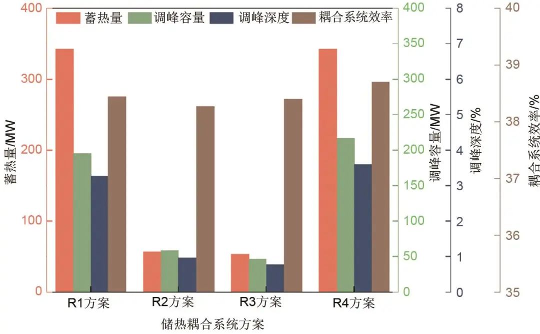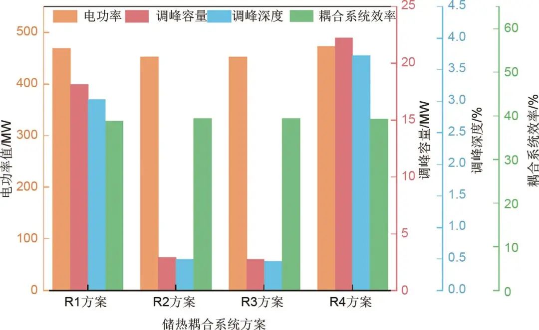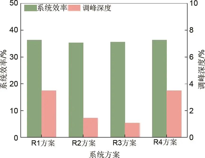圖10和圖11展示了四種方案在30%THA工況下抽取相同蒸汽流量時(shí)耦合系統(tǒng)的電功率、調(diào)峰容量、蓄熱量、系統(tǒng)效率和調(diào)峰深度??梢钥闯?,當(dāng)從中壓缸抽取再熱蒸汽,并在其放熱后返回除氧器時(shí),會(huì)同時(shí)降低蒸汽在中壓缸和低壓缸的做功,導(dǎo)致汽輪機(jī)輸出功率降低顯著,為21.03 MW。但由于此時(shí)抽取的蒸汽放熱充分,因此調(diào)峰容量、調(diào)峰深度和蓄熱量更大。當(dāng)抽取主蒸汽或再熱蒸汽,并在其釋熱后返回低壓缸入口時(shí),僅會(huì)降低蒸汽在中壓缸的做功,對(duì)汽輪機(jī)的輸出功率影響不明顯,如方案R3,僅能降低6.54 MW。此外,當(dāng)電廠以低負(fù)荷運(yùn)行時(shí),更大的蓄熱量對(duì)耦合系統(tǒng)效率的貢獻(xiàn)更為顯著。在方案R1和R4中,其蓄熱量為68.51 MW,使得耦合系統(tǒng)效率相較于無(wú)儲(chǔ)熱配置電廠效率提高0.12%。儲(chǔ)能過(guò)程中,方案R1~R4的單位儲(chǔ)熱負(fù)荷的調(diào)峰容量分別為0.31 MW,0.77 MW,0.61 MW和0.31 MW。可以看出,方案R2的儲(chǔ)熱模式能夠以更低的儲(chǔ)熱負(fù)荷實(shí)現(xiàn)儲(chǔ)能過(guò)程中更高的調(diào)峰性能。