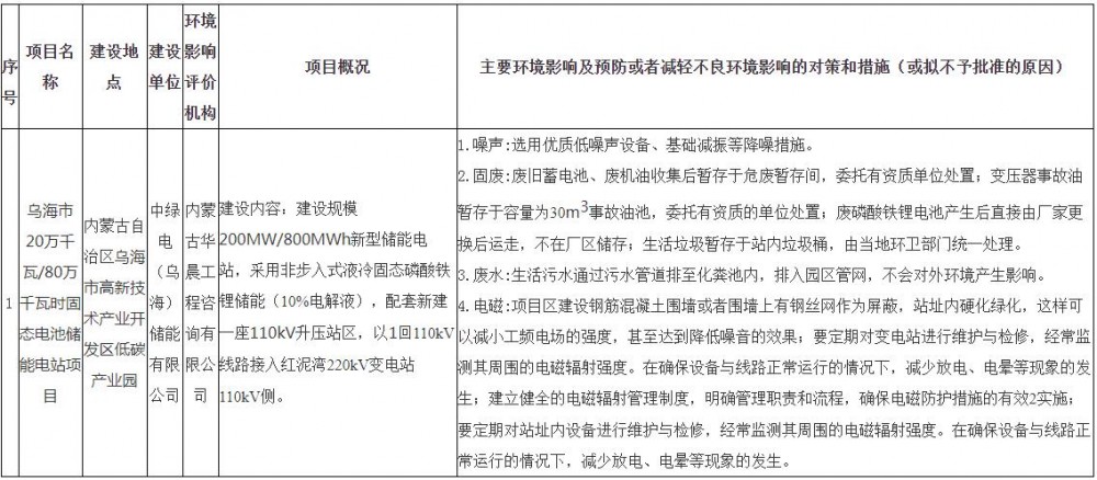 烏海市生態(tài)環(huán)境局關(guān)于2025年6月17日對(duì)烏海市20萬(wàn)千瓦/80萬(wàn)千瓦時(shí)固態(tài)電池儲(chǔ)能電站項(xiàng)目建設(shè)項(xiàng)目環(huán)境影響評(píng)價(jià)文件擬審批公示