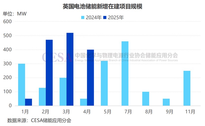 截至2024年底,英國電池儲能累計裝機達4.5GW。盡管2024年英國電池儲能新增裝機較之2023年有所下滑,但隨著電網(wǎng)規(guī)模電池儲能系統(tǒng)的擴張,預(yù)計2025年英國電池儲能將回溫反彈。
