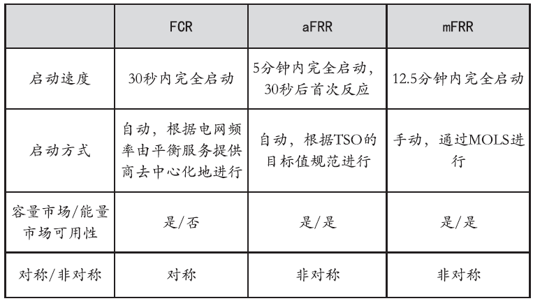 德國平衡市場的產(chǎn)品種類包括:頻率控制備用(The Frequency Containment Reserve,F(xiàn)CR),即一次調(diào)頻,保證系統(tǒng)頻率穩(wěn)定在額定頻率的±0.1赫茲內(nèi);自動頻率恢復(fù)備用(The automatic Frequency Restoration Reserve,aFRR),通常在FCR之后啟動,用于進一步糾正頻率偏差,主要通過自動頻率控制系統(tǒng)實現(xiàn);手動頻率恢復(fù)備用(The manual Frequency Restoration Reserve,mFRR),是15分鐘內(nèi)響應(yīng)的備用服務(wù)。