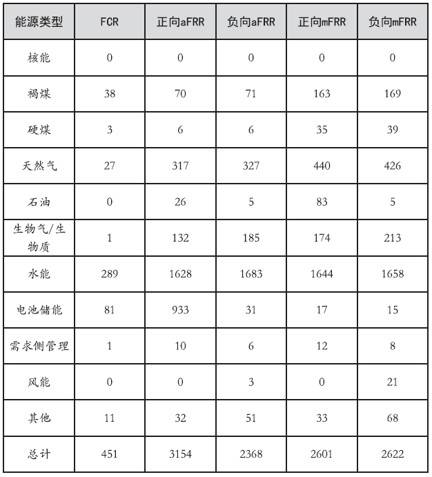 表2 德國不同平衡服務(wù)種類各類型資源預(yù)審核合格的容量統(tǒng)計2