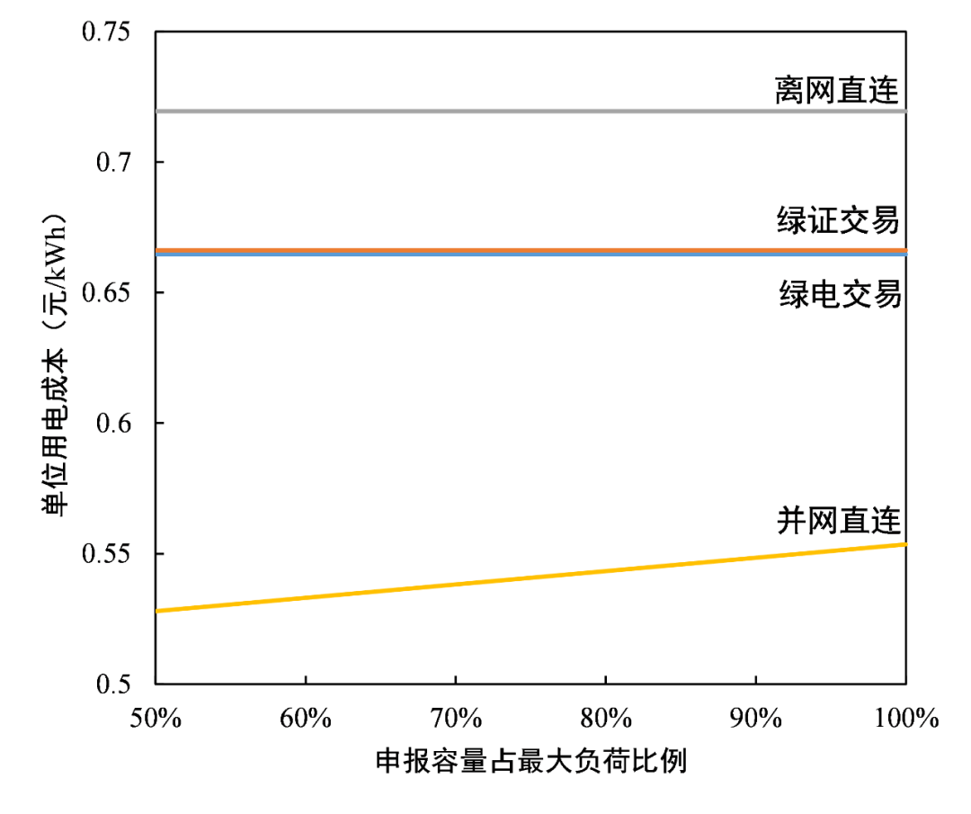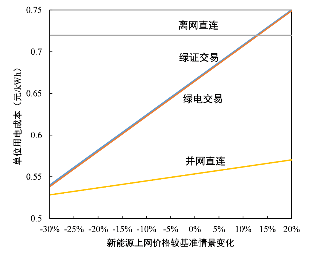 隨著綠電價(jià)格的下降,通過公共電網(wǎng)購(gòu)電的三種模式單位用電成本將隨之下降。2024年,算例所在地區(qū)的新能源市場(chǎng)平均價(jià)格(0.4023元/千瓦時(shí))主要對(duì)標(biāo)煤電基準(zhǔn)電價(jià)(0.372元/千瓦時(shí)),較其度電成本(風(fēng)0.2249元、光0.3594元)高79%和12%。在新能源全面入市政策推動(dòng)下,若新能源交易價(jià)格實(shí)現(xiàn)下降,那么綠電、綠證交易模式將逐漸凸顯其成本優(yōu)勢(shì)(本算例新能源交易價(jià)格較2024年均價(jià)下降30%左右),并網(wǎng)型綠電直連模式的經(jīng)濟(jì)競(jìng)爭(zhēng)力將會(huì)受到一定挑戰(zhàn)。