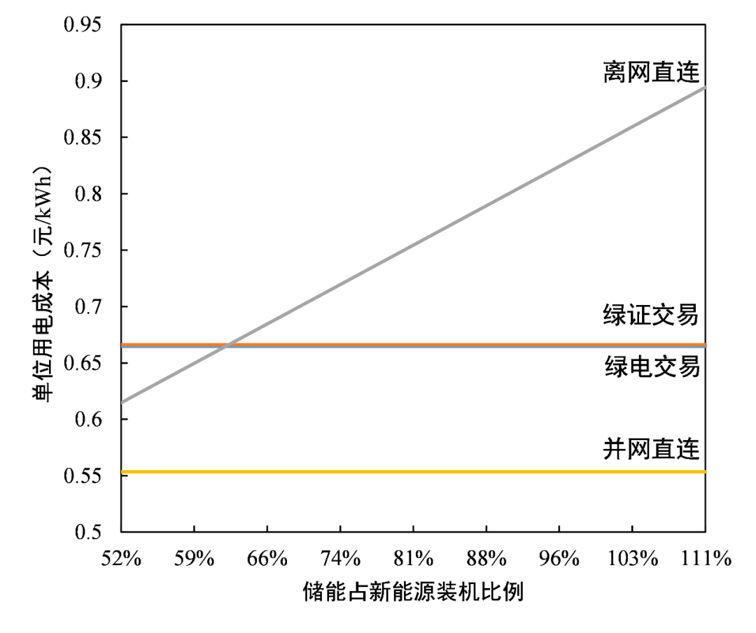 離網(wǎng)型直連模式需要大量的儲(chǔ)能進(jìn)行調(diào)峰,因此度電成本最高。本文基準(zhǔn)場(chǎng)景中儲(chǔ)能放電時(shí)長(zhǎng)為4小時(shí),在2小時(shí)和8小時(shí)下,數(shù)據(jù)中心單位用電成本分別降低24%和上升49%,可見離網(wǎng)模式下儲(chǔ)能的配置容量對(duì)其經(jīng)濟(jì)性有決定性影響。