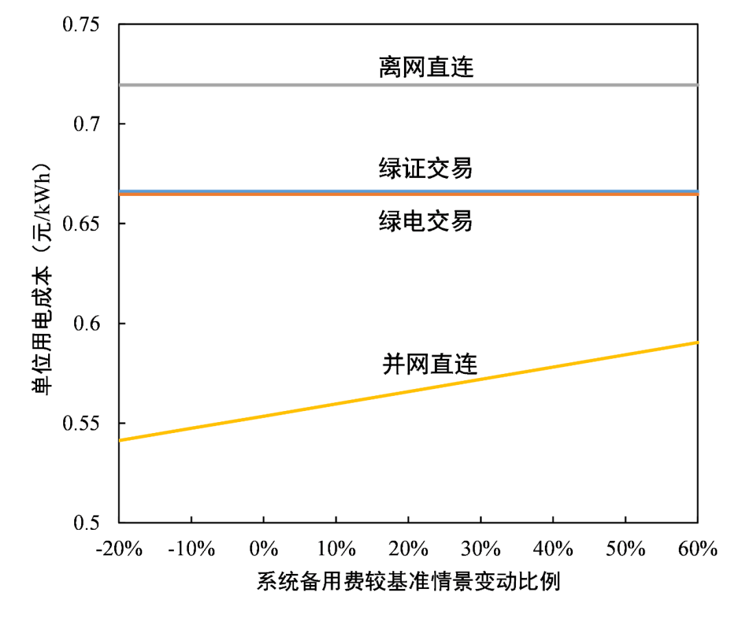 測(cè)算結(jié)果表明,在基準(zhǔn)情景的參數(shù)設(shè)定條件下,并網(wǎng)型直連模式的單位用電成本最低。該模式結(jié)合了大電網(wǎng)供電和直連模式的優(yōu)勢(shì):一方面,借助“綠電直連”機(jī)制,數(shù)據(jù)中心可直接獲取物理可溯源的綠色電力,同時(shí)鎖定具有成本優(yōu)勢(shì)的綠電價(jià)格;另一方面,通過保留與公共電網(wǎng)的連接,數(shù)據(jù)中心可獲得電網(wǎng)備用支持,滿足調(diào)峰、備用等不確定性電力需求,顯著降低對(duì)儲(chǔ)能的依賴。但需要說明的是,當(dāng)前系統(tǒng)備用費(fèi)收取細(xì)則尚未出臺(tái),該測(cè)算結(jié)果是基于系統(tǒng)備用費(fèi)按容(需)量電價(jià)考慮的。傳統(tǒng)容(需)量電價(jià)是基于穩(wěn)定負(fù)荷設(shè)計(jì)的,并網(wǎng)型直連項(xiàng)目若不配置儲(chǔ)能,整體負(fù)荷特性表現(xiàn)為較大的波動(dòng)性(平均負(fù)荷率較低),需要電網(wǎng)頻繁為其調(diào)峰,系統(tǒng)備用成本可能升高。