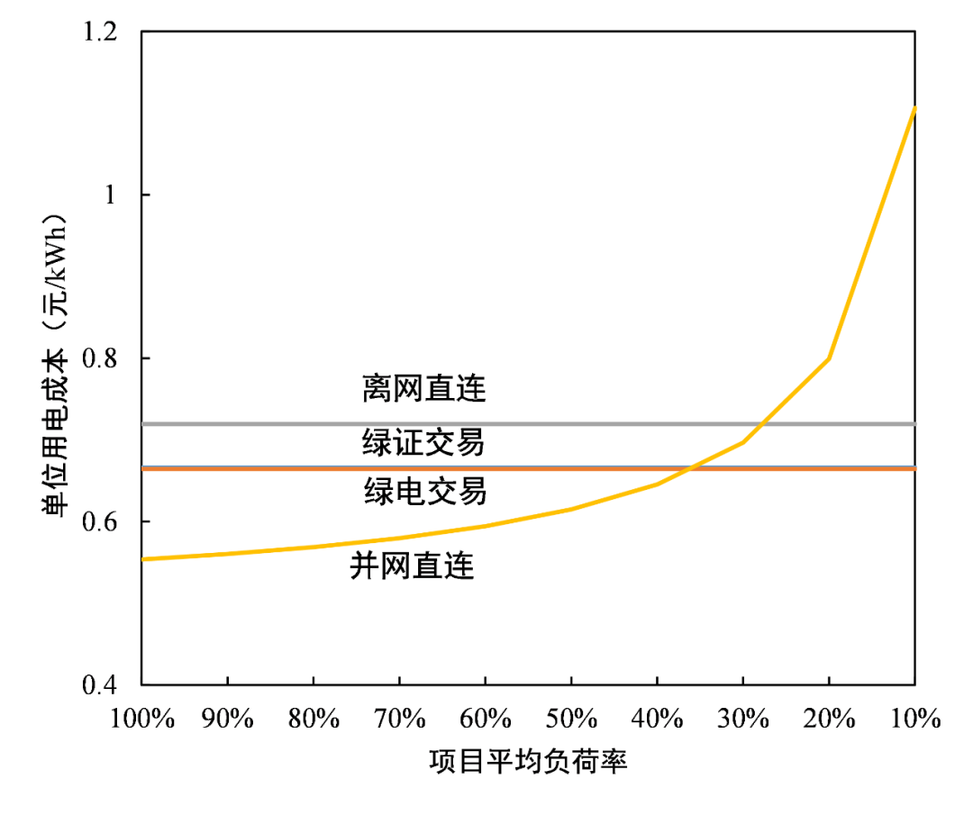 圖4上圖為在基準(zhǔn)情境下按比例調(diào)整系統(tǒng)備用費(fèi)的單位用電成本變化?!锻ㄖ芬?,充分提升項(xiàng)目靈活性調(diào)節(jié)能力,盡可能減小系統(tǒng)調(diào)節(jié)壓力。項(xiàng)目平均負(fù)荷率反應(yīng)了源荷作為整體的波動(dòng)特性,也反應(yīng)了需要電網(wǎng)提供調(diào)節(jié)的壓力。為反映電網(wǎng)調(diào)節(jié)壓力,假定取項(xiàng)目平均負(fù)荷率的倒數(shù)作為系統(tǒng)備用費(fèi)的費(fèi)率,負(fù)荷率越接近1,需要電網(wǎng)調(diào)節(jié)的需求越低,備用費(fèi)越低,反之越高。測(cè)算結(jié)果如圖4所示,在項(xiàng)目平均負(fù)荷率為36%時(shí),并網(wǎng)直連模式的單位用電成本與綠電、綠證交易模式相同。