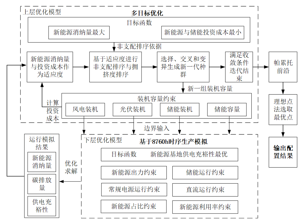 本文提出了一種基于多目標雙層優(yōu)化與8760h時序生產(chǎn)模擬的大型新能源基地風(fēng)光儲容量聯(lián)合規(guī)劃方法。建立了兼顧投資經(jīng)濟性、發(fā)電清潔性和供電充裕性的多目標雙層優(yōu)化模型,上層模型優(yōu)化風(fēng)光儲配置容量,下層模型開展全年8760h的運行優(yōu)化模型,考慮了受端電網(wǎng)晚高峰時段保供需求、直流通道利用率、新能源外送電量、常規(guī)電源與儲能運行等約束條件,采用NSGA-II結(jié)合時序生產(chǎn)模擬雙層優(yōu)化方法求解模型,獲取風(fēng)光儲配置容量的帕累托前沿解集合,考慮投資成本、碳排放量和供電充裕性,通過理想點方法篩選出風(fēng)光儲最優(yōu)配置方案?;谖覈鞅蹦承履茉椿財?shù)據(jù)開展仿真測試,驗證了方法的有效性。圖1為多目標優(yōu)化雙層規(guī)劃模型結(jié)構(gòu)。