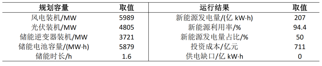 以我國西北某新能源基地場景為例進行仿真測試。系統(tǒng)最優(yōu)配置結(jié)果如表1所示:風(fēng)電裝機為5989MW,光伏裝機為4805MW,儲能裝機為3721MW和5879MW·h,風(fēng)光儲總投資成本711億元,新能源利用率94.4%,新能源發(fā)電量占比為50%,全年無供電缺口。