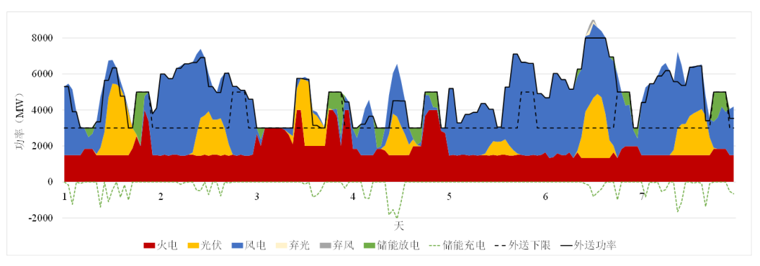圖2展示了連續(xù)7日的基地時序運行曲線,所提出方法能夠合理優(yōu)化風(fēng)-光-火-儲-直逐時段的發(fā)電運行方式,滿足了新能源高效外送消納、火電低碳運行和晚高峰時段受端電網(wǎng)保供需求,如:在第1、第3—4、第7日18:00—21:00晚高峰時段,風(fēng)電出力較低,通過儲能放電和火電增加出力滿足了晚高峰保供需求;在第2、5日晚高峰18:00—21:00時段,風(fēng)電大發(fā),火電降至最小技術(shù)出力;在第6日11:00—15:00時段風(fēng)電和光伏同時大發(fā)時段,火電維持最小技術(shù)出力,直流已達到最大外送功率,儲能通過充電消納了大部分棄電。
