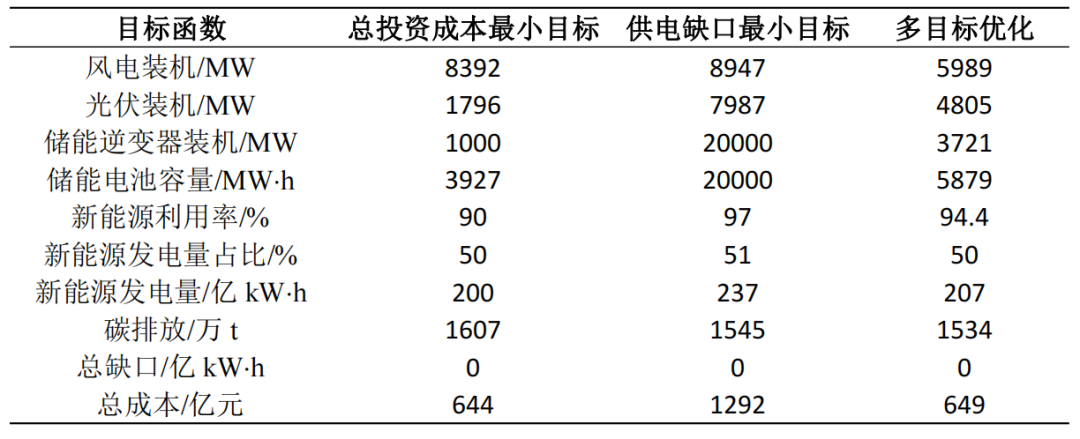 表2比較了本文的多目標優(yōu)化和單目標優(yōu)化的容量優(yōu)化配置結(jié)果??偼顿Y成本最小目標下配置的新能源裝機規(guī)模最小,但碳排放量較大,新能源發(fā)電量與利用率較低;供電缺口最小目標下,系統(tǒng)供電缺口為0,但總投資成本和火電碳排放量高于其他場景。本文所提的多目標優(yōu)化方法能夠在保證系統(tǒng)穩(wěn)定供電和新能源外送消納需求的情況下,盡可能降低風(fēng)光儲投資成本和火電碳排放量,與單目標優(yōu)化配置結(jié)果相比體現(xiàn)出了很好的優(yōu)勢。