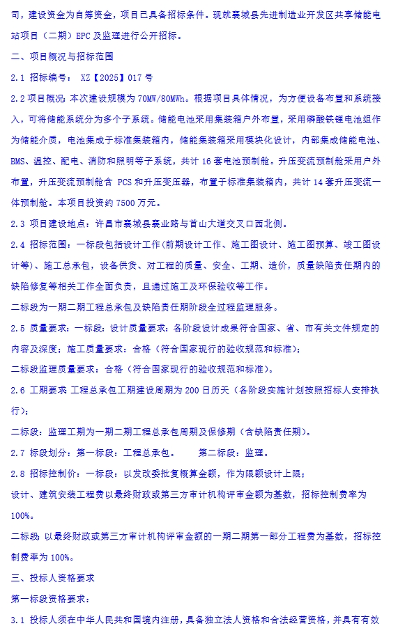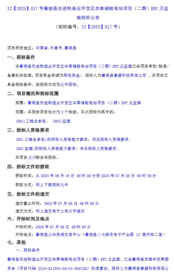 中國(guó)儲(chǔ)能網(wǎng)訊:6月16日,許昌市城投發(fā)展集團(tuán)旗下襄城縣譽(yù)盛科技有限公司發(fā)布襄城縣先進(jìn)制造業(yè)開發(fā)區(qū)共享儲(chǔ)能電站項(xiàng)目(二期)EPC及監(jiān)理招標(biāo)公告。項(xiàng)目位于河南省許昌市,本次建設(shè)規(guī)模為70MW/80MWh。儲(chǔ)能電池采用集裝箱戶外布置,采用磷酸鐵鋰電池組作為儲(chǔ)能介質(zhì),電池集成于標(biāo)準(zhǔn)集裝箱內(nèi),儲(chǔ)能集裝箱采用模塊化設(shè)計(jì),內(nèi)部集成儲(chǔ)能電池、BMS、溫控、配電、消防和照明等子系統(tǒng),共計(jì) 16 套電池預(yù)制艙。升壓變流預(yù)制艙采用戶外布置,升壓變流預(yù)制艙含 PCS 和升壓變壓器,布置于標(biāo)準(zhǔn)集裝箱內(nèi),共計(jì) 14 套升壓變流體預(yù)制艙。