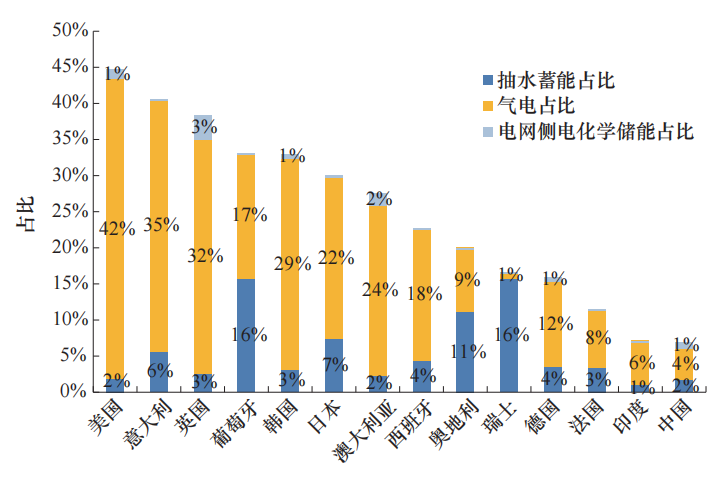 圖2 各主要國家調(diào)節(jié)電源裝機規(guī)模占電力總裝機比例