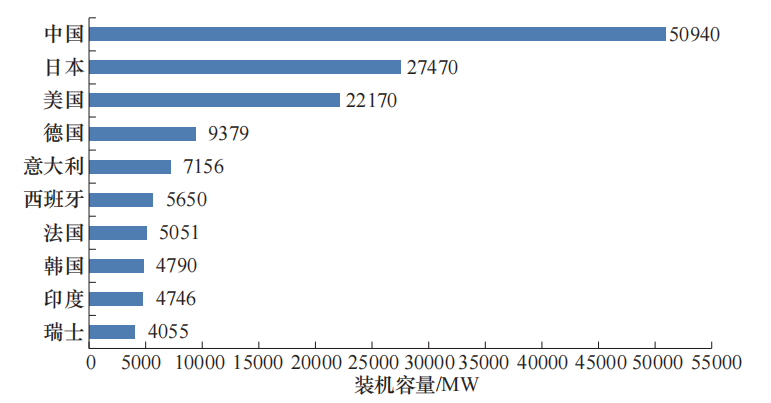 圖3 全球抽水蓄能裝機容量排名前十的國家及其裝機容量[10]