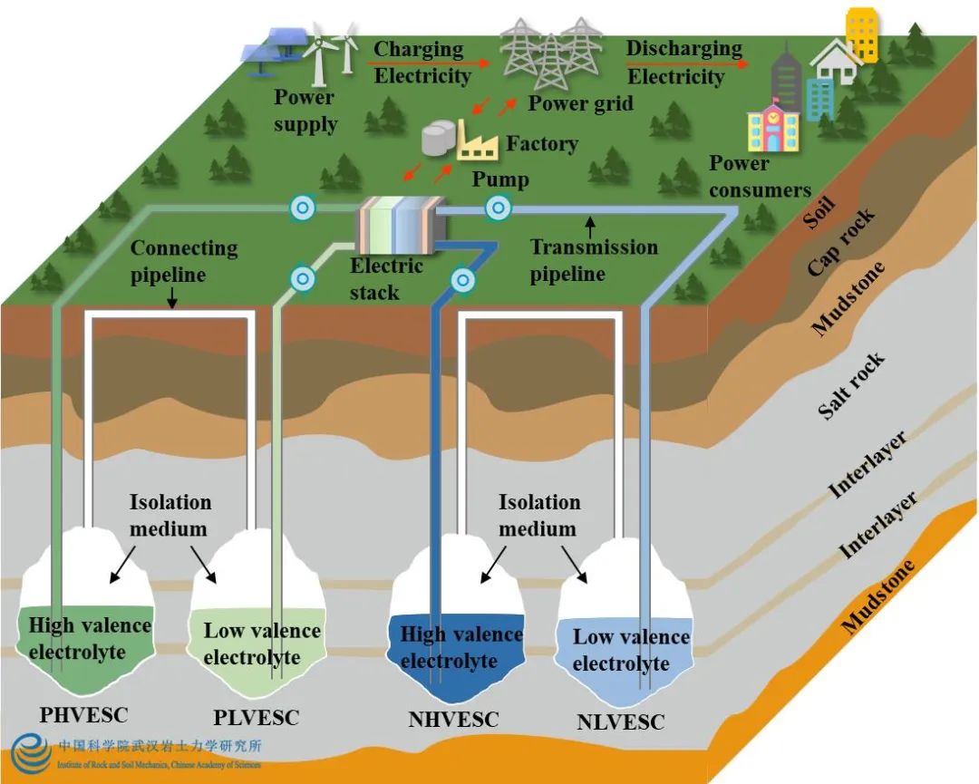 中國(guó)儲(chǔ)能網(wǎng)訊:可再生能源的間歇性和波動(dòng)性對(duì)大規(guī)模集成后的電網(wǎng)可靠性提出了重大挑戰(zhàn),開發(fā)高效、經(jīng)濟(jì)、可靠的儲(chǔ)能技術(shù)成為解決可再生能源大規(guī)模應(yīng)用瓶頸的關(guān)鍵。地下液流電池是指利用地下鹽穴或人工硐室作為地面液流電池正負(fù)極電解液的大型儲(chǔ)存空間,并通過電堆實(shí)現(xiàn)能量?jī)?chǔ)存與釋放的一種新型儲(chǔ)能技術(shù)。以鹽穴作為電解液的儲(chǔ)存場(chǎng)所,則必須考慮到我國(guó)鹽巖的基本賦存特點(diǎn)是鹽巖層數(shù)多、單層厚度薄和含不溶或難溶夾層多,屬于典型的薄互層鹽巖構(gòu)造。因此,在我國(guó)建設(shè)鹽穴液流電池不可避免地會(huì)遇到多夾層與沉渣對(duì)液流電池電化學(xué)性能的影響,以及電解液長(zhǎng)時(shí)侵蝕對(duì)圍巖力學(xué)及孔滲特性的影響,即鹽穴賦存特征與液流電池電解液相互作用機(jī)制。而目前尚未有針對(duì)該機(jī)制研究,因此,亟需對(duì)該機(jī)制開展深入研究,搶占科技制高點(diǎn),為我國(guó)鹽穴液流電池儲(chǔ)能技術(shù)的創(chuàng)新與發(fā)展提供理論基礎(chǔ)與技術(shù)支撐。