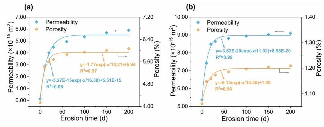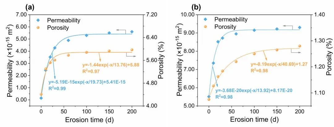 圖3 陽極電解液MV侵蝕處理:(a)夾層樣品的孔隙度和滲透率與侵蝕時(shí)長(zhǎng)的關(guān)系;(b)鹽巖樣品的孔隙度和滲透率與侵蝕時(shí)長(zhǎng)的關(guān)系