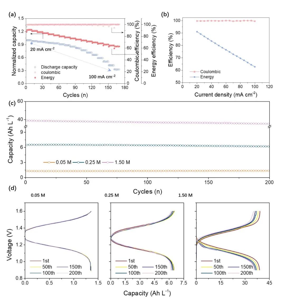 圖4 以鹽礦原位飽和鹵水作為支持電解質(zhì)的TMA-TEMPO/MV的速率性能和穩(wěn)定性:(a)不同電流密度下的放電容量;(b)不同電流密度下的庫侖效率和能量效率;(c)電解質(zhì)濃度分別為0.05、0.25和1.5 M,在40 mA·cm-2下循環(huán)200次放電容量;(d)第1、50、100、150和200次循環(huán)對(duì)應(yīng)的充放電曲線