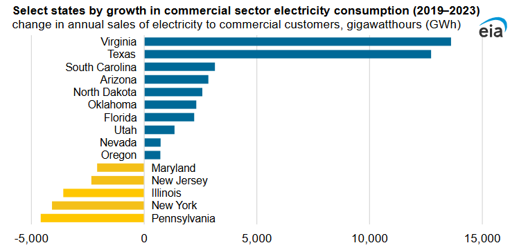 圖1:美國各州商業(yè)電力消耗變化(2019-2023年)