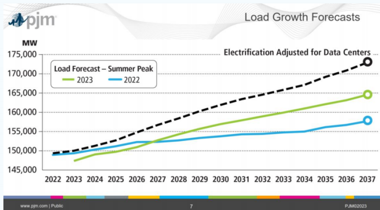 作為美國最大的數(shù)據(jù)中心樞紐之一,弗吉尼亞州集中了全球超過35%的超大型數(shù)據(jù)中心。PJM對2028年夏季負荷峰值的預測由2022年的152.7吉瓦增長至2023年的155.7吉瓦,增長約2%,在考慮數(shù)據(jù)中心的因素后將增長更多。自2019年以來,弗吉尼亞州已經(jīng)至少開設(shè)了75個數(shù)據(jù)中心,且根據(jù)弗吉尼亞公共事業(yè)公司Dominion Energy的數(shù)據(jù),2028年,弗吉尼亞州的數(shù)據(jù)中心的容量可能會相較于2023年增長一倍,進一步影響美國的電力需求。