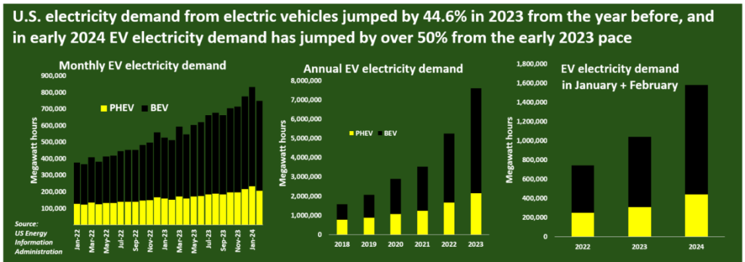美國電動汽車電力需求在2024年初激增,用電量超鐵路用電需求。根據(jù)EIA數(shù)據(jù),2023年,美國電動汽車占所有輕型汽車總銷量的16%,電動汽車的總用電量首次超過美國鐵路的用電需求,達到760萬兆瓦時,同比增長了45%。自2023年初以來,美國電動汽車用電量增長約52%,超過了2022年公布的40%增長率的預測值,電動汽車銷量快速增長對于電力市場的影響持續(xù)增加。截至2024年2月,電動汽車的總用電量為1580吉瓦時,相比2023年同期的1040吉瓦時,同比增長了51.92%。