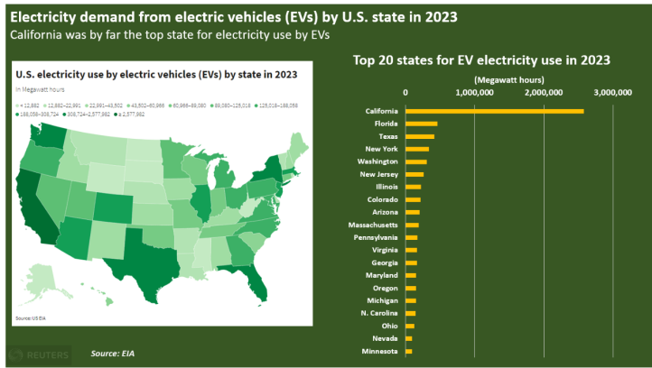 2023年,加利福尼亞州與佛羅里達州(458.77吉瓦時)、得克薩斯州(417.03吉瓦時)、紐約州(337.37吉瓦時)和華盛頓州(308.72吉瓦時)共同成為電動汽車電力需求最大的五個州。除了電動車耗電量排名前五的州之外,2023年,其他13個州的電動汽車充電耗電量超過100吉瓦時。