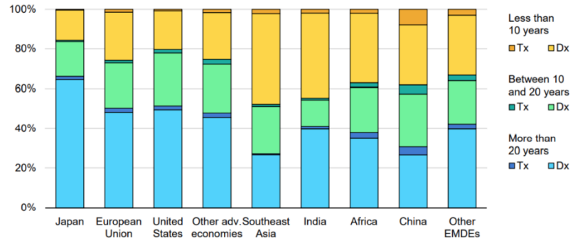 美國電網(wǎng)老化問題日益嚴重,設(shè)備升級改造迫在眉睫。根據(jù)IEA的一項調(diào)查數(shù)據(jù),在所有調(diào)查國家和地區(qū)中,除日本外,美國超20年的輸配電線路占比最大,面臨嚴重的電網(wǎng)老化問題。