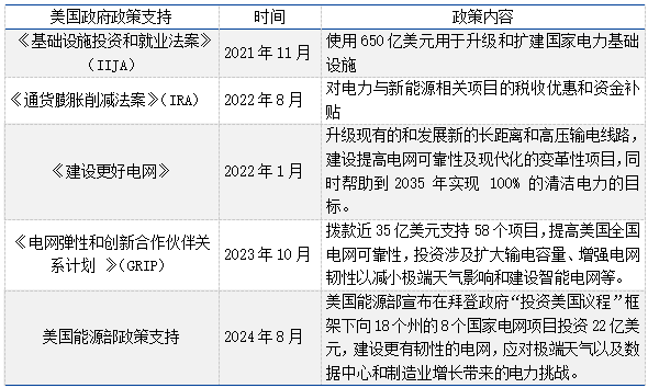 多重政策推動電網(wǎng)建設(shè),補貼力度增大促進產(chǎn)業(yè)發(fā)展。2022年,美國出臺《建設(shè)更好電網(wǎng)》計劃,提出將200億美元作為首批投資,用于建設(shè)提高電網(wǎng)可靠性及現(xiàn)代化的變革性項目。2021年提出的《基礎(chǔ)設(shè)施投資和就業(yè)法案》(IIJA)和IRA也有力地支持了電力基礎(chǔ)設(shè)施建設(shè),共同助力電網(wǎng)撥款投資建設(shè)。2024年8月6日,美國能源部宣布向18個州的8個國家電網(wǎng)項目投資22億美元,多個加強電網(wǎng)建設(shè)的政策出臺,旨在提高電網(wǎng)韌性以應對可再生能源與負荷增長帶來的壓力。