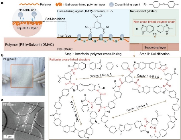 為突破這一限制,李先鋒團(tuán)隊(duì)提出了一種界面交聯(lián)新策略,通過(guò)將聚合物交聯(lián)反應(yīng)限制在有限的界面空間內(nèi),制備出由納米級(jí)分離層和支撐層組成的超薄聚合物膜。測(cè)試結(jié)果表明,分離層中穩(wěn)健的共價(jià)交聯(lián)網(wǎng)絡(luò)結(jié)構(gòu)提高了膜的機(jī)械穩(wěn)定性,其橫向拉伸強(qiáng)度和縱向硬度均優(yōu)于商業(yè)化的Nafion 212膜,使的所開(kāi)發(fā)聚合物膜材料的厚度可以降低至3 μm。