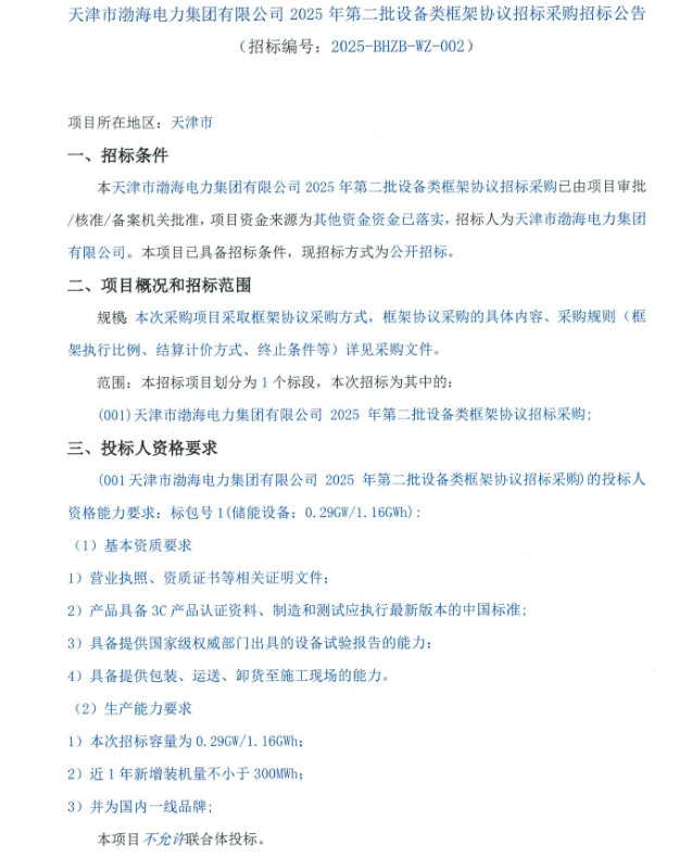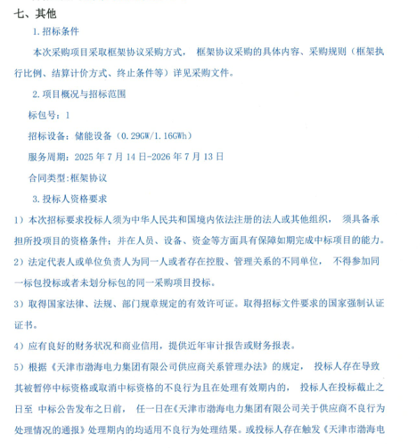 招標(biāo)內(nèi)容為儲(chǔ)能設(shè)備0.29GW/1.16GWh。