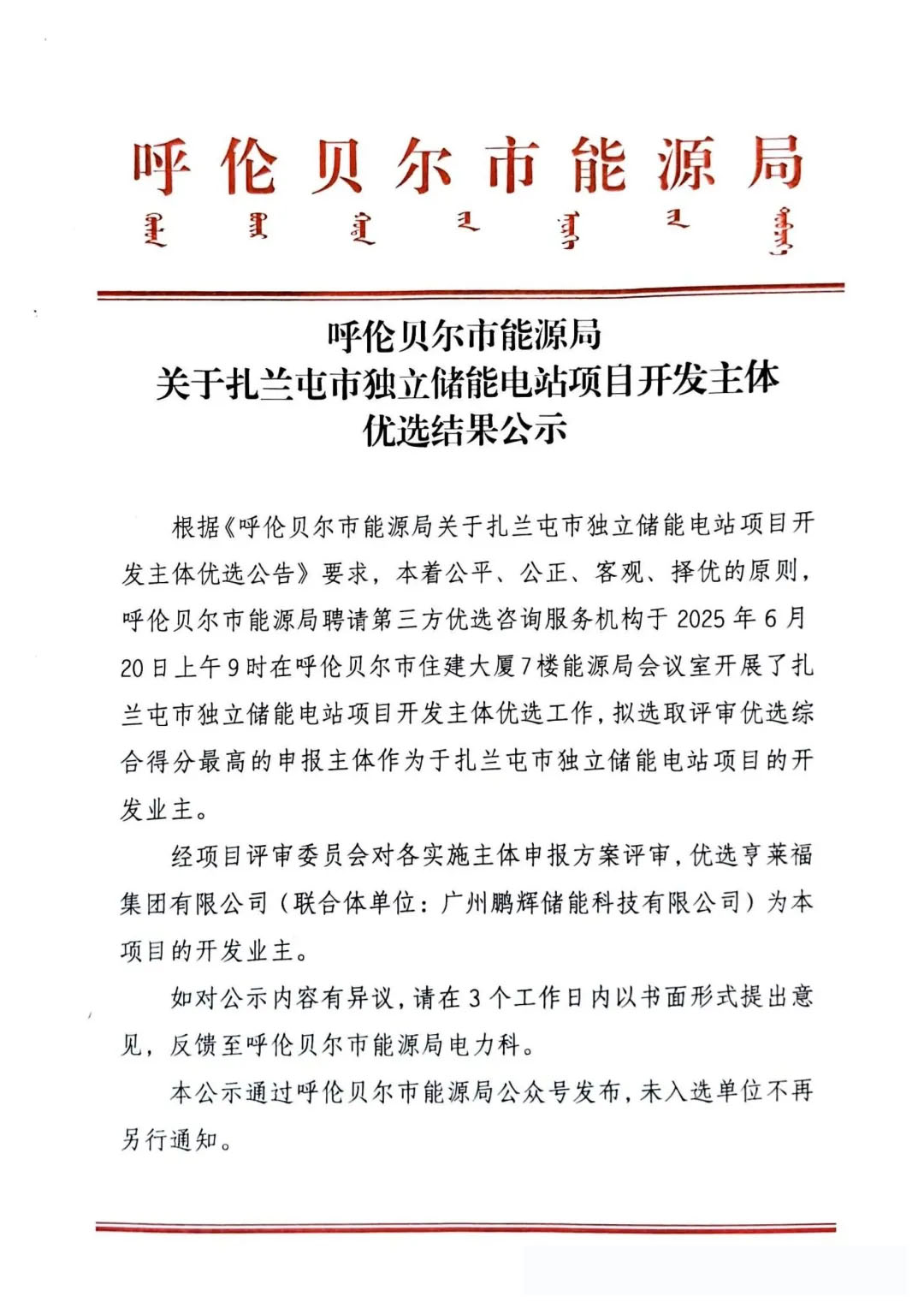 中國(guó)儲(chǔ)能網(wǎng)訊:6月23日,呼倫貝爾市能源局發(fā)布關(guān)于扎蘭屯市獨(dú)立儲(chǔ)能電站項(xiàng)目開發(fā)主體優(yōu)選結(jié)果公示。
