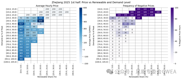 從2025年1月至5月,浙江、山東兩省的現(xiàn)貨市場(覆蓋日前與實時)均出現(xiàn)了大范圍、長時段的負(fù)電價。浙江作為新近啟動現(xiàn)貨機(jī)制的省份,春節(jié)出現(xiàn)深度長時間負(fù)價;而山東作為持續(xù)試點較久的區(qū)域,其負(fù)電價現(xiàn)象更為頻繁,大部分觸及最低限價,低電價幅度也更深。圖2為兩地在2025年迄今為止的平均電價/負(fù)電價分布及對應(yīng)的風(fēng)光出力占比與需求水平。