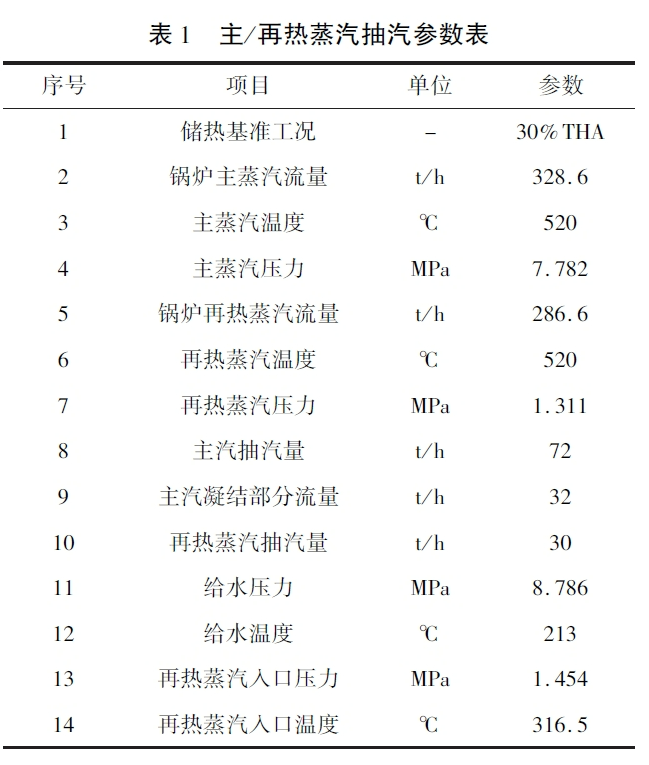 本系統(tǒng)方案儲(chǔ)熱基準(zhǔn)工況設(shè)定為30%THA,根據(jù)汽機(jī)熱平衡圖,30%THA負(fù)荷主汽參數(shù)為520℃/7.782MPa,再熱蒸汽參數(shù)為520℃/1.454MPa。根據(jù)系統(tǒng)方案抽汽蓄能調(diào)峰區(qū)間為30%~24.%THA,為滿(mǎn)足調(diào)峰要求,同時(shí)抽取主、再熱蒸汽,經(jīng)過(guò)核算主汽抽汽量為72t/h,其中32t/h蒸汽用于釋放顯熱和潛熱加熱熔鹽冷凝為水,經(jīng)過(guò)循環(huán)泵加壓與給水參數(shù)匹配,剩余40t/h主汽只通過(guò)釋放顯熱加熱熔鹽,換熱后的蒸汽參數(shù)經(jīng)過(guò)減溫減壓與冷段參數(shù)進(jìn)行匹配。