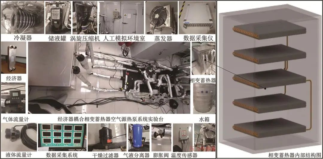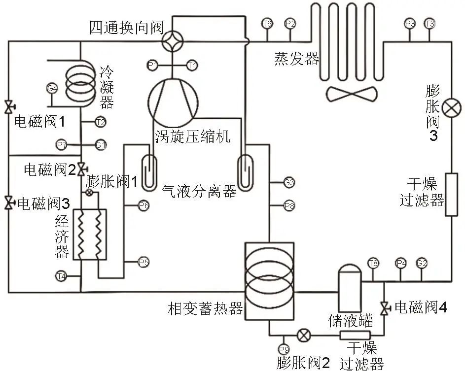 基于上述調(diào)研可發(fā)現(xiàn)準(zhǔn)二級(jí)壓縮技術(shù)(經(jīng)濟(jì)器補(bǔ)氣技術(shù))與儲(chǔ)能技術(shù)(相變蓄熱技術(shù))均有助于空氣源熱泵在低溫環(huán)境下的性能提升。為確保更廣泛用戶群體在極端氣候條件下的供暖需求,上述系統(tǒng)的制熱效率及適用性仍需進(jìn)一步優(yōu)化。在前期研究基礎(chǔ)上,該工作將準(zhǔn)二級(jí)壓縮技術(shù)(經(jīng)濟(jì)器補(bǔ)氣技術(shù))與儲(chǔ)能技術(shù)(相變蓄熱技術(shù))相結(jié)合,借助實(shí)驗(yàn)方法探究新系統(tǒng)在不同外界溫度下的制熱量、COP、排氣溫度等關(guān)鍵宏觀參數(shù)的變化規(guī)律。