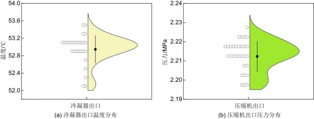 圖3 數(shù)據(jù)采集300 s內(nèi)冷凝器出口溫度和壓縮機(jī)出口壓力分布圖:(a) 冷凝器出口溫度分布;(b) 壓縮機(jī)出口壓力分布