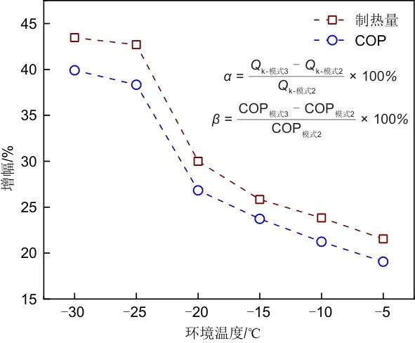 為了進(jìn)一步比較模式2和模式3的系統(tǒng)制熱量和COP的大小,以模式2作為基準(zhǔn)采用相對(duì)增幅來(lái)說(shuō)明此問(wèn)題,制熱量相對(duì)增幅()與COP相對(duì)增幅(β)的表達(dá)式如下: