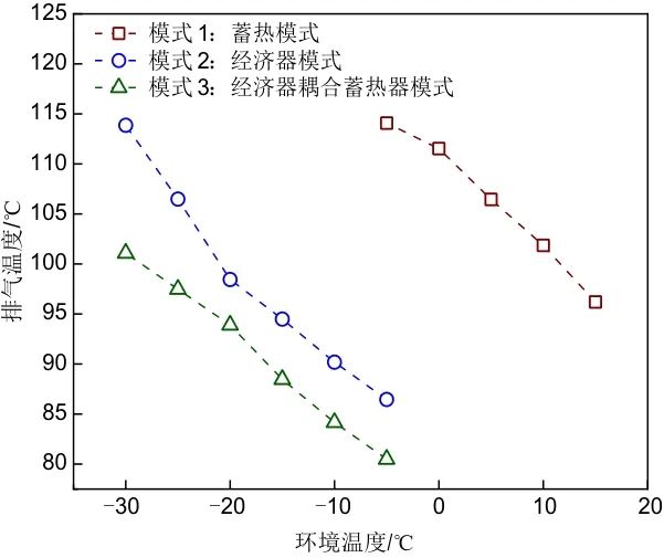 圖9 不同運(yùn)行模式下壓縮機(jī)的排氣溫度隨環(huán)境溫度的變化