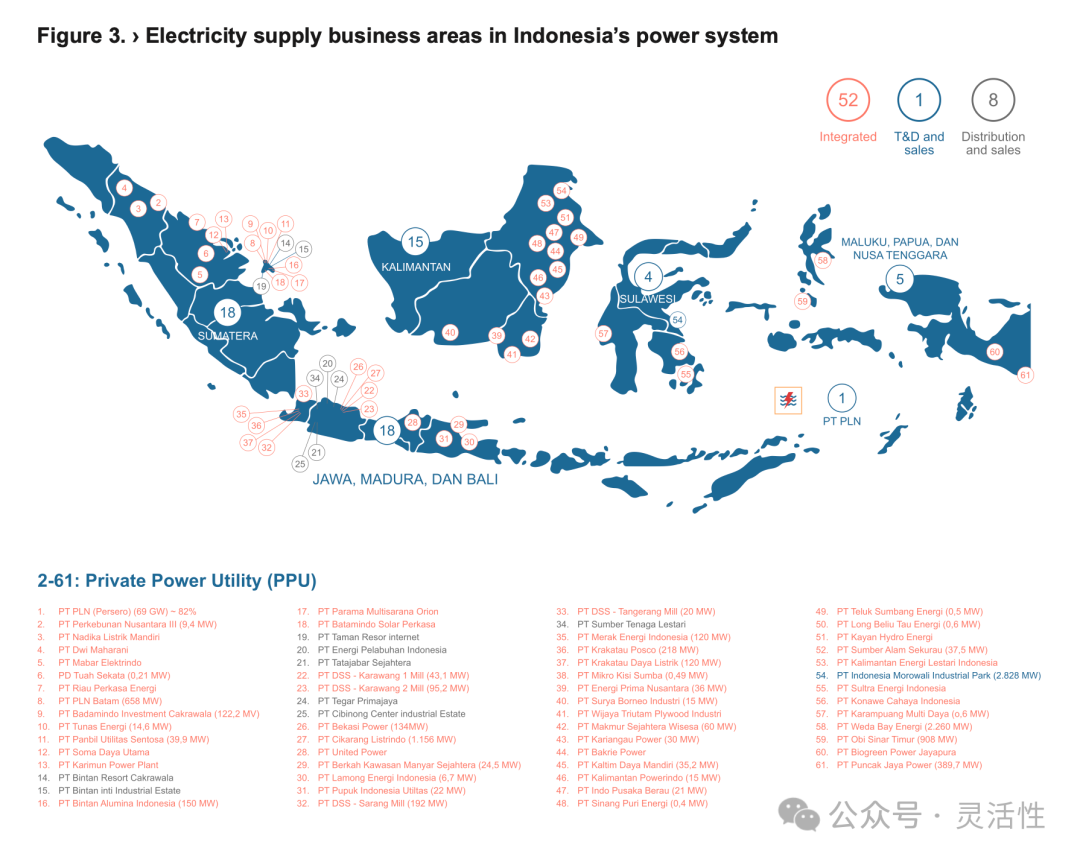 PLN于2004年成為國有有限責(zé)任公司:PT PLN。它在2022年底經(jīng)歷了另一輪重組過程,轉(zhuǎn)變?yōu)橐患覔碛兴膫€(gè)子控股公司的控股公司,每個(gè)子控股公司下設(shè)多個(gè)子公司。關(guān)于PLN未來結(jié)構(gòu)的討論仍在進(jìn)行中,亞洲開發(fā)銀行(ADB)最近的一份報(bào)告概述了重組該公司的路線圖,旨在創(chuàng)建一個(gè)具有競爭性采購和成本反映電價(jià)的獨(dú)立單一買方模式(ADB,2023)。截至2024年,尚未宣布關(guān)于此事的官方?jīng)Q定。