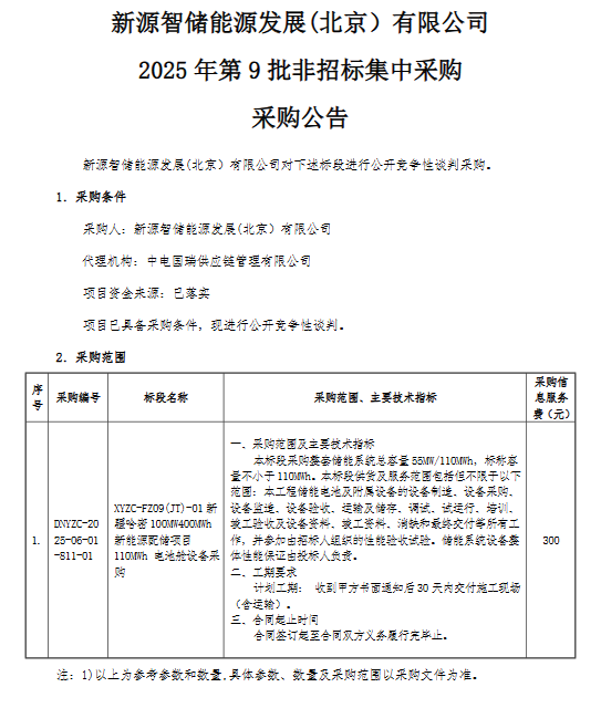 中國儲能網(wǎng)訊:國家電投子公司新源智儲能源發(fā)展(北京)有限公司發(fā)布2025年第9批采購,項(xiàng)目名稱為新疆哈密100MW/400MWh新能源配儲項(xiàng)目110MWh電池艙設(shè)備采購。項(xiàng)目資金來源已落實(shí)。