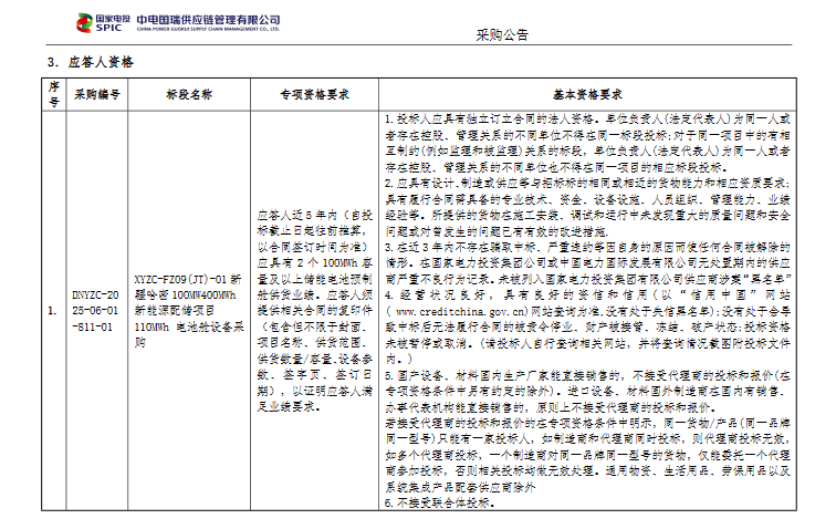 要求應(yīng)答人近5年內(nèi)應(yīng)具有2個100MWh容量及以上儲能電池預(yù)制艙供貨業(yè)績。