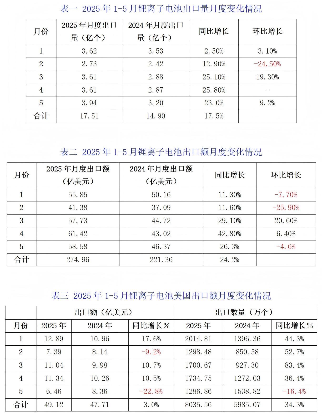 中國儲能網(wǎng)訊:根據(jù)海關(guān)最新統(tǒng)計數(shù)據(jù),2025年1-5月鋰離子電池出口數(shù)量為17.51億個,同比增長17.5%;2025年1-5月我國鋰離子電池出口額為274.96億美元,同比增加24.2%,延續(xù)了穩(wěn)定增長勢頭。其中,2025年5月份,出口額58.58億美元,環(huán)比下降4.6%,5月份,出口數(shù)量為3.94億個,環(huán)比增長9.2%。出口總體呈現(xiàn)量增價跌趨勢。